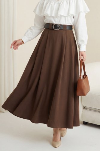Kalın Kemerli Önü Pileli Yan Cepli Fermuarlı Tivil Etek Kahve