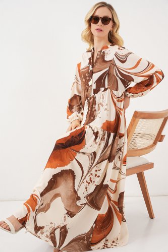 • Desenli Uzun Tesettür Elbise 2585 Kahverengi