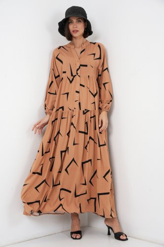 • Desenli Uzun Tesettür Elbise 2585 A Vizon